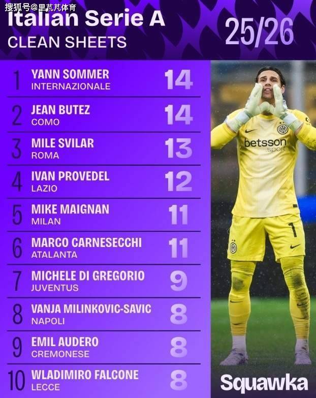 足球数据网站Squawka统计本赛季意甲门将零封榜,索默14次第一,迈尼昂第五,迪格雷戈里奥第七。